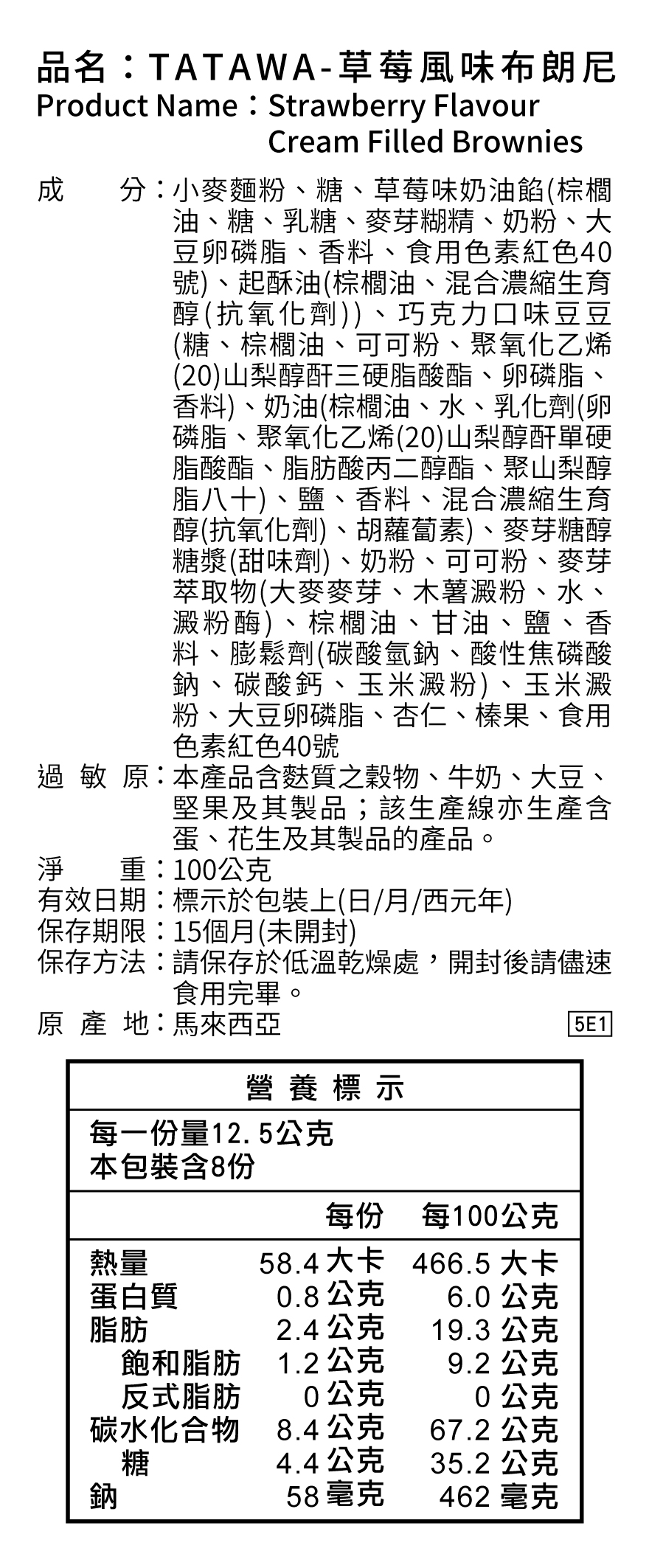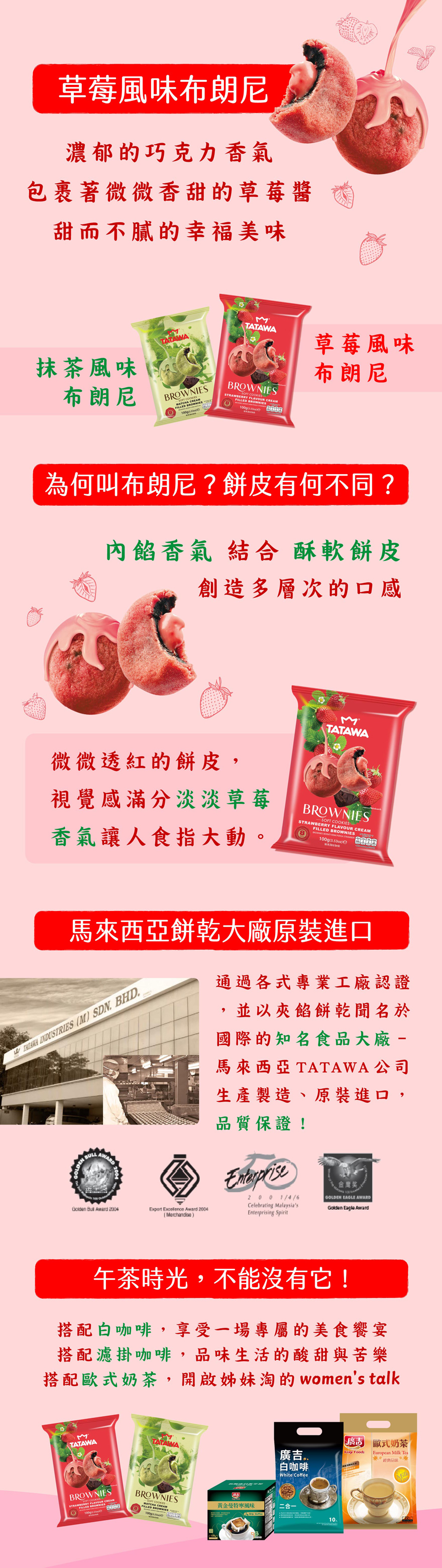■馬來西亞餅乾大廠原裝進口 ■淡淡草莓香氣的酥軟餅皮 ■包覆濃郁巧克力與甜而不膩的草莓內餡 ■入口即化的美味,讓你一口就愛上 ■獨立小包裝,便利又衛生 ■奶素可食