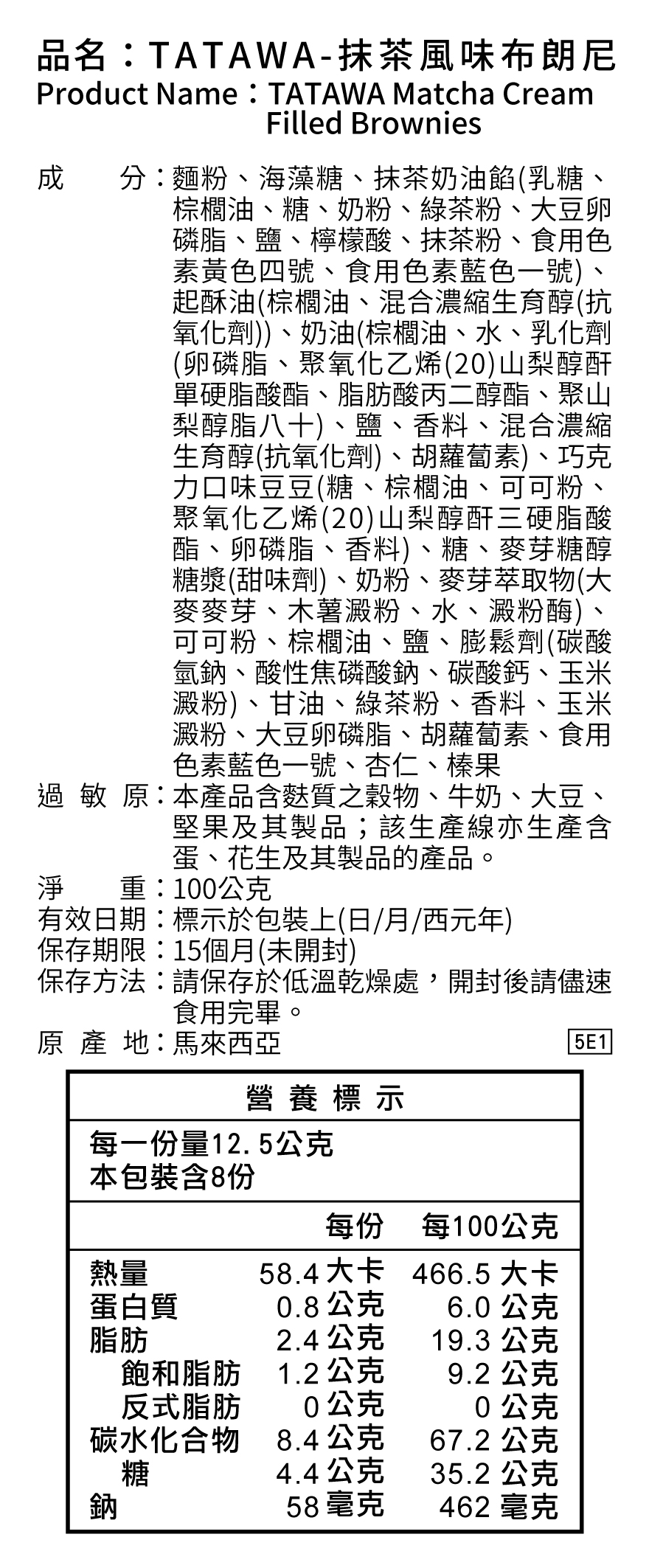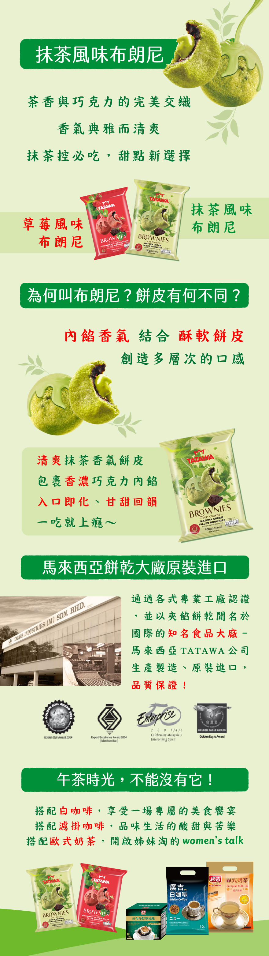 ■馬來西亞餅乾大廠原裝進口 ■清爽抹茶香氣的酥軟餅皮 ■典雅茶香內餡與香濃巧克力的完美交織 ■入口即化的美味,讓你一口就愛上 ■獨立小包裝,便利又衛生 ■奶素可食