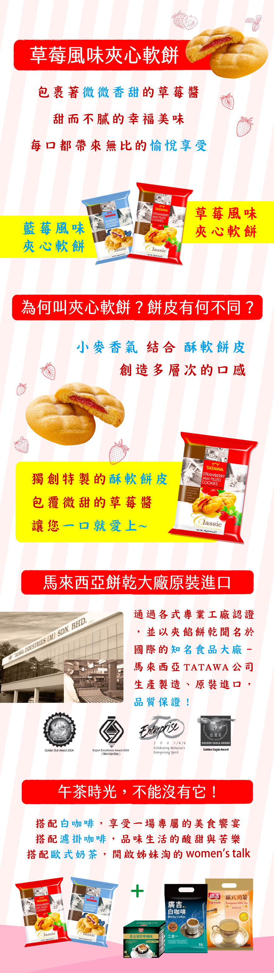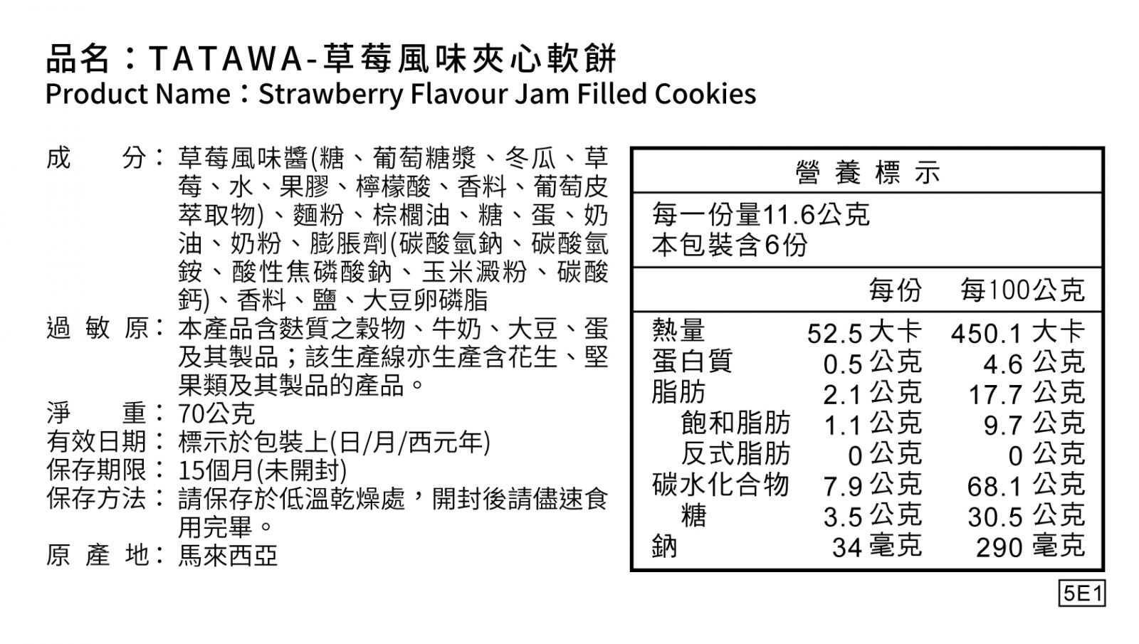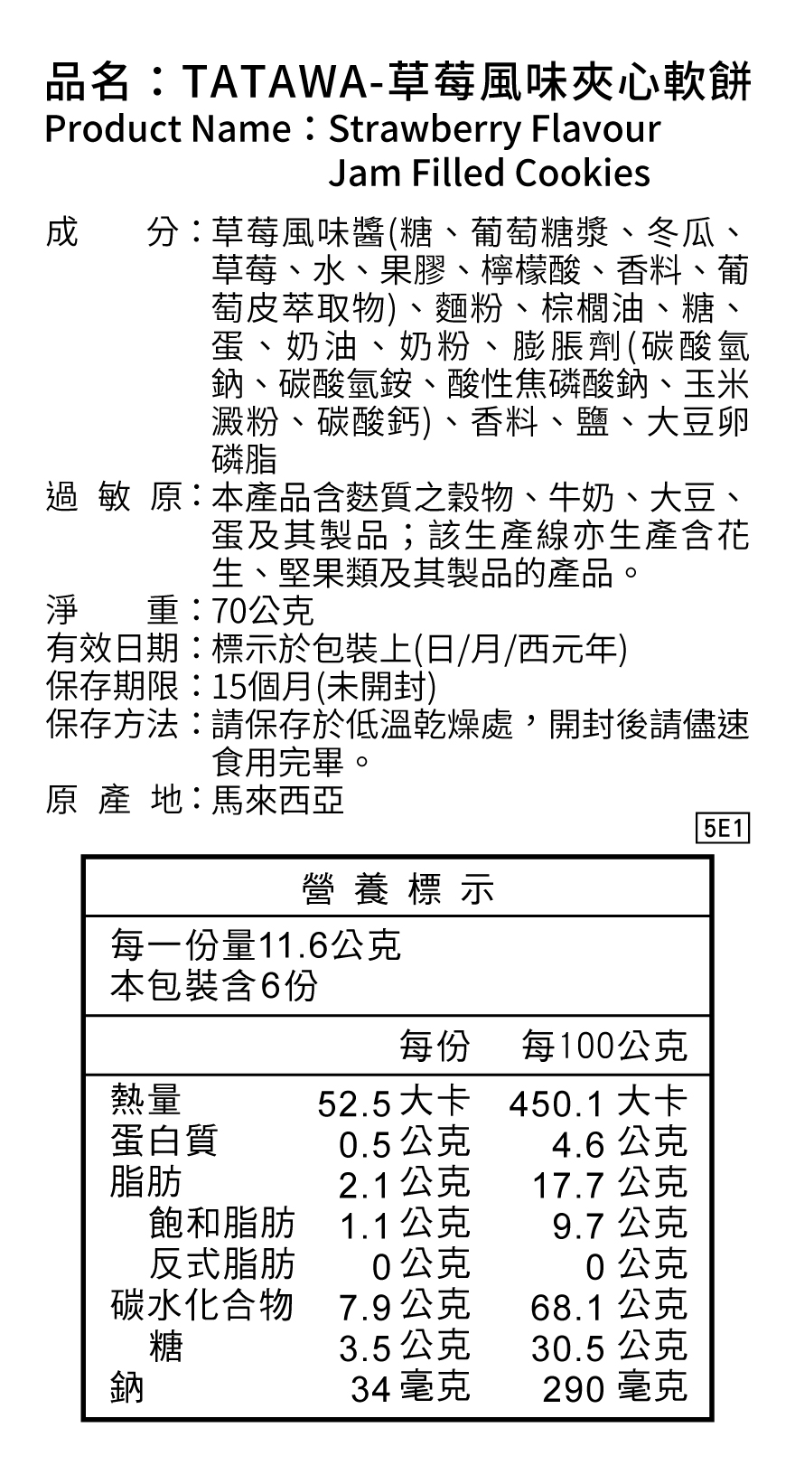 ■馬來西亞餅乾大廠原裝進口 ■獨創配方特製而成的酥軟餅皮 ■包覆微甜不膩口的草莓醬 ■入口即化的美味,讓你一口就愛上 ■獨立小包裝,便利又衛生 ■奶蛋素可食